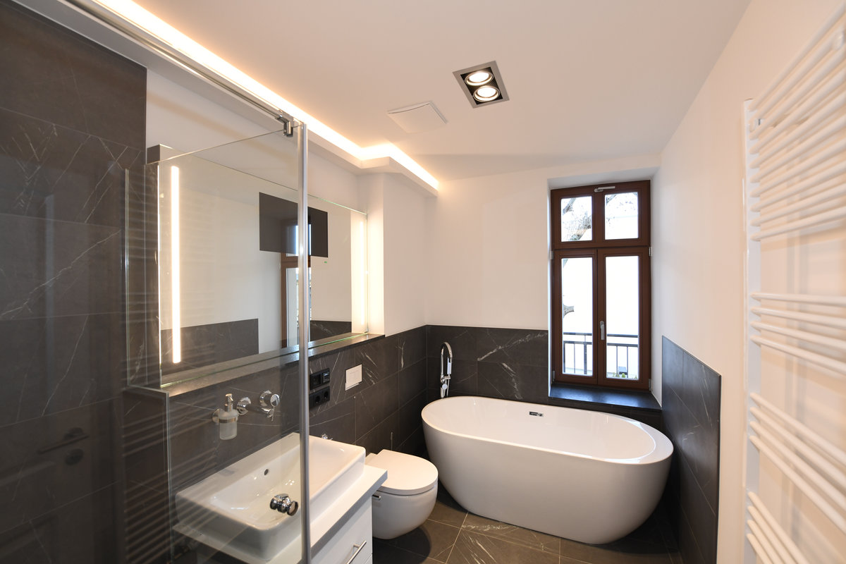 Feinsteinfliesen in den Bädern pietra grey